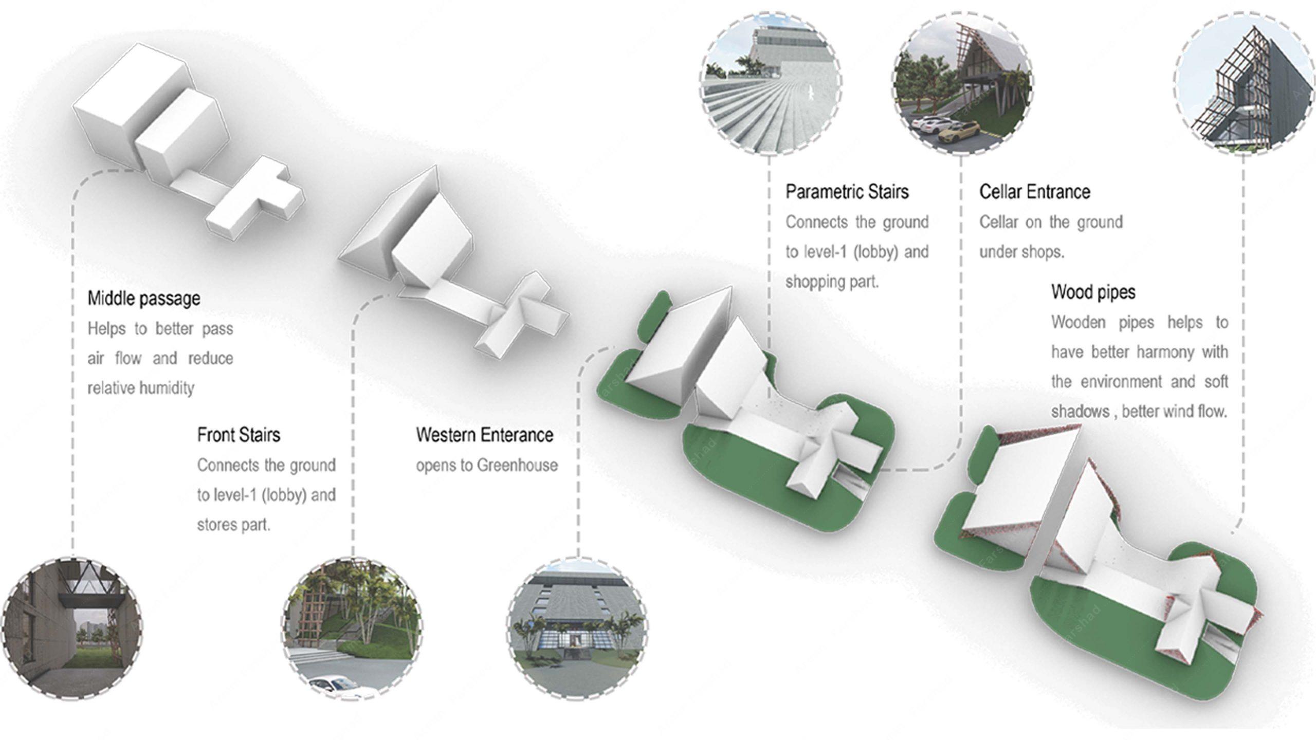 در کنار ساختمان اصلی هتل، یک سازهی کوچک با ارتفاع ۴ متر بالاتر از سطح زمین طراحی شده است که از طریق لابی و همچنین پلههای پارامتریک پشت هتل قابل دسترسی است. با بهرهگیری از سقف شیبدار، طرح کلی توانسته معماری سنتی و بومی منطقهی گیلان را حفظ کند و در عین حال با ترکیب پلههای پارامتریک، معماری مدرن را نیز در خود نگه دارد.