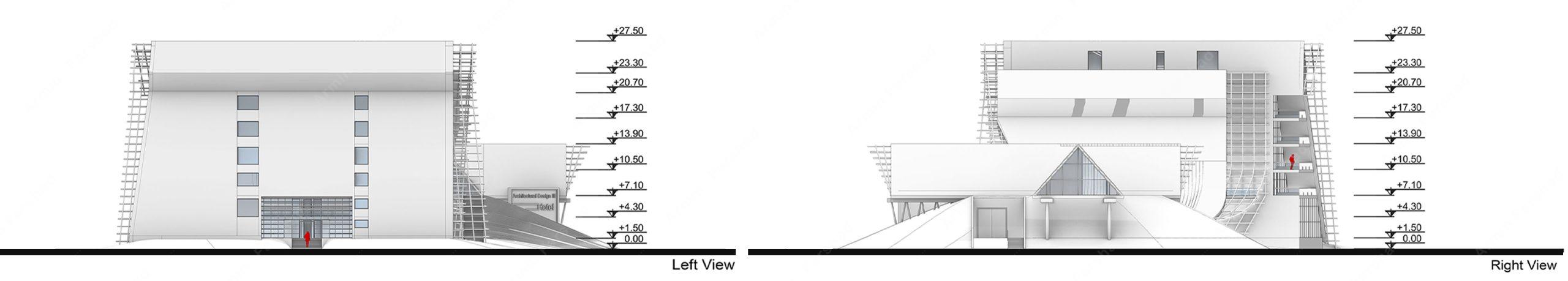 این پروژه شامل طراحی یک هتل در بندر انزلی، استان گیلان بود—شهری با آبوهوای مرطوب و بارندگی شدید در زمستان. تأمین آسایش مهمانان نیازمند توجه به رطوبت، محافظت در برابر باران و نیازهای عملکردی بود. نتیجهی این فرآیند طراحی اقلیممحور، هتلی چندمنظوره شد که در ادامه نمایش داده شده است.