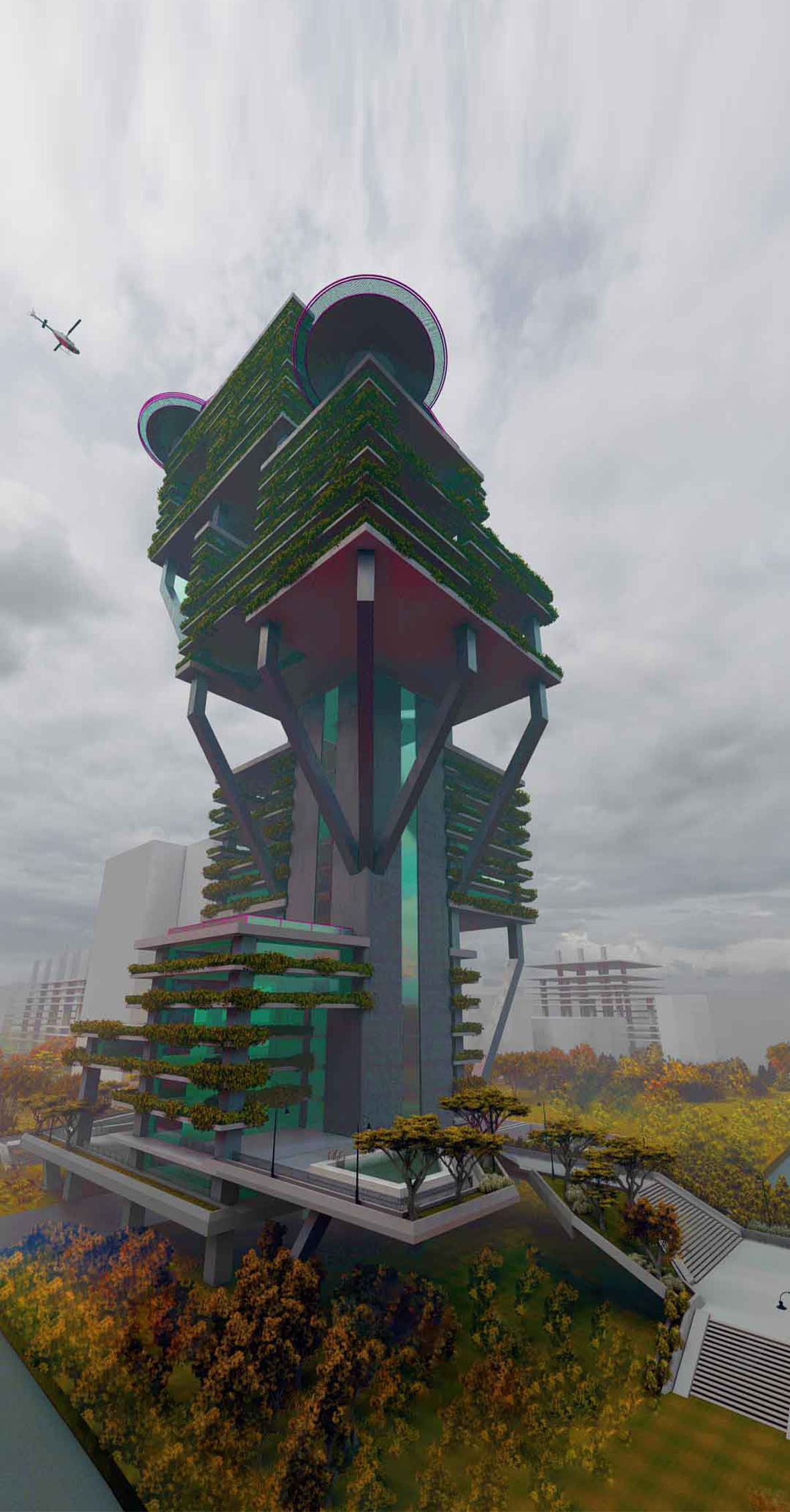 این پروژه هدف دارد یک آسمانخراش چندمنظوره با امکاناتی مانند فروشگاههای رفاهی، مهدکودکها، باشگاههای ورزشی، استخرها، دفاتر و خدمات اجتماعی طراحی کند. مفهوم این پروژه با ماژولهای مکعبی آغاز شد—چهار مکعب که روی هم قرار گرفته و جابجا شدهاند تا فضاهای پویای “فاصله و پر” ایجاد کنند. سپس یک سازه آهنی شامل تیرها و ستونها اضافه شد که شکل برج را ایجاد کرد.